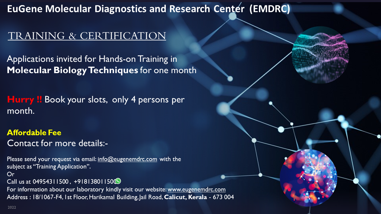 EUGENE MOLECULAR DIAGNOSTICS AND RESEARCH CENTRE (EMDRC) is a start-up company committed to providing the most convenient and friendly Molecular blood testing service to the physicians of Kerala and their patients and also for giving training for students in the field of Molecular testing and to conduct research work in the field of laboratory medicine. EMDRC has been founded as a Limited Liability Partnership (LLP) registered under Ministry of Corporate Affairs, Govt. of India. This lab would be catering to the need of the patients. The lab has been set up with molecular diagnostic facilities, like Infectious Diseases identification and Quantification, detection of cancer markers in blood, detection of genetic disorders in humans etc. This advanced Moleculardiagnostic centre will also provide platform for doctors and researchers to work on their novel concepts and innovative ideas that can be immediately implemented. The academic wing of the biotechnology wing will coordinate with doctors and researchers to support them with wet lab and computation work to materialise the innovative concepts.